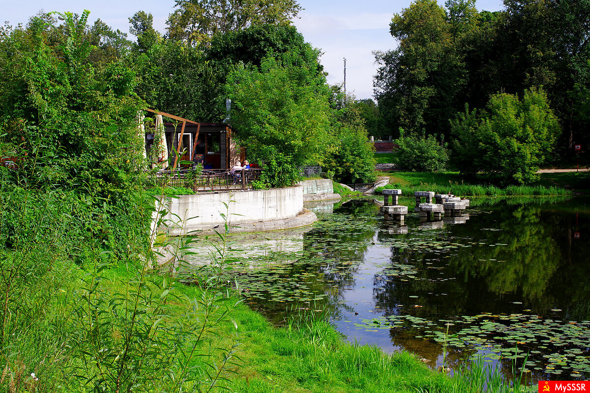 Плотина на Верхнем Кузьминском пруду в Кузьминском парке в Москве. Август 2023.