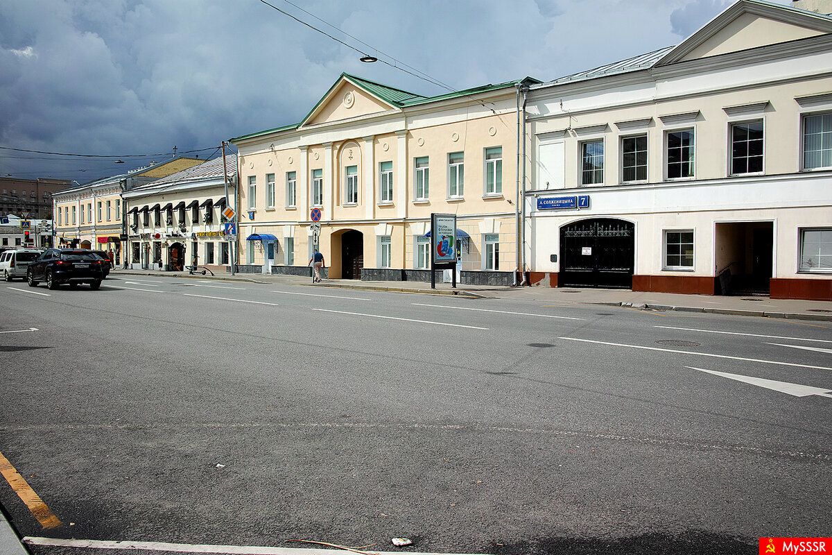Улица Большая Алексеевская (Александра Солженицына) в Москве. Жилой дом купца М.З. Быкова. Главный дом усадьбы купца А.П. Заборова. Август 2024.
